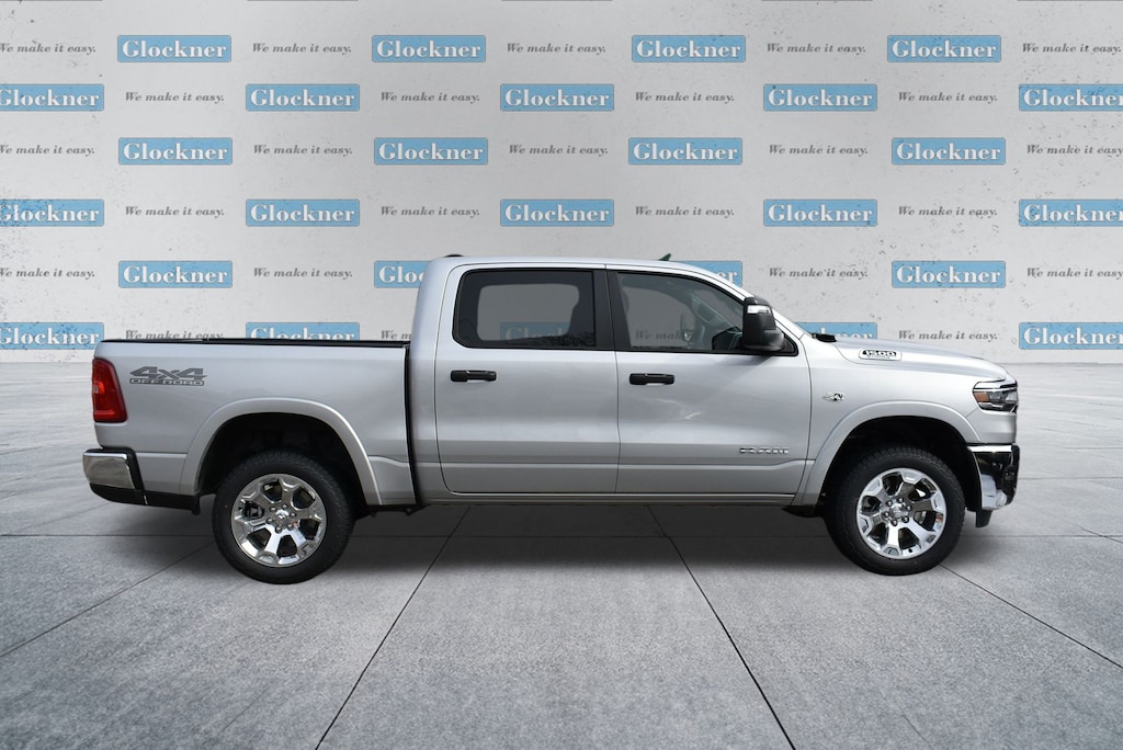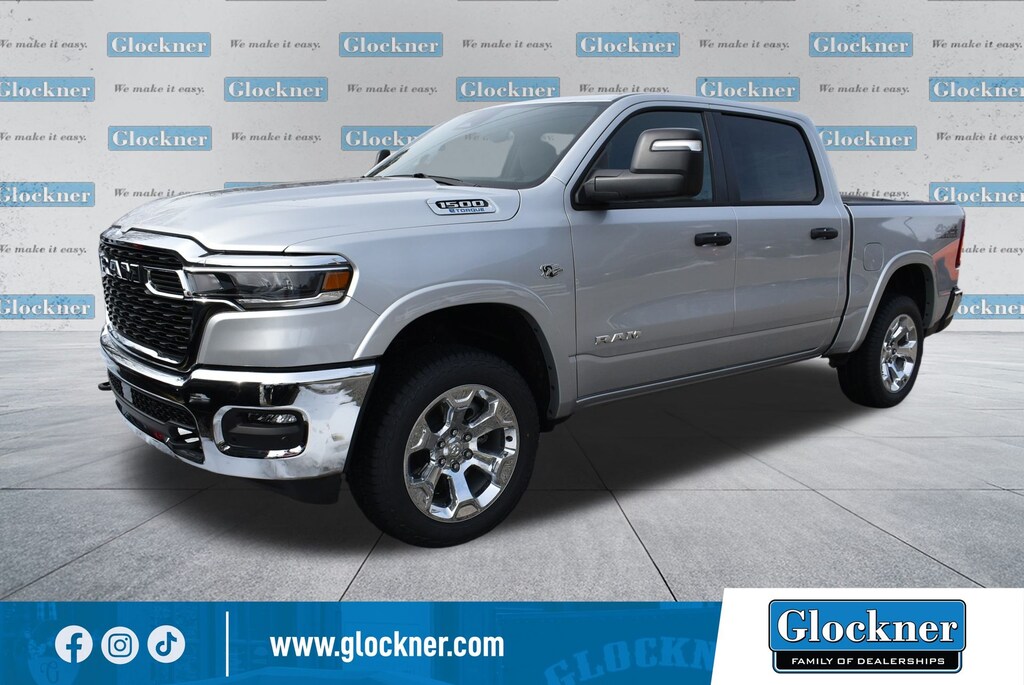 Glockner Chrysler Jeep Dodge Ram is proud to offer this terrific 2026 Ram 1500 in Silver Zynith. This 2026 Ram 1500 has passed our comprehensive inspection and comes with the following features; Big Horn Level 2 Equipment Group (115V Auxiliary Power Outlet, 115V Auxiliary Rear Power Outlet, 12" Touchscreen Display, 2nd Row in Floor Storage Bins, 3 Rear Seat Head Restraints, 4 Way Front Headrests, 400W Inverter, 4G LTE Wi-Fi Hot Spot, 9 Amplified Speakers with Subwoofer, Air Conditioning ATC with Dual Zone Control, Apple CarPlay, Auto Power-Folding Mirrors, Auto-Dimming Exterior Driver Mirror, Auto-Dimming Rear-View Mirror, Black Exterior Mirrors, Black Premium Power Mirrors, Body Color Fender Flares, Bucket Seats, Center Console Parts Module, Cluster 7.0" TFT Color Display, Configurable Drive Mode, Connected Travel and Traffic Services, Connectivity - US/Canada, Convex Wide-Angle Exterior Mirror Insert, Deluxe Cloth Bucket Seats, Disassociated Touchscreen Display, Exterior Mirrors Courtesy Lamps, Exterior Mirrors with Heating Element, Exterior Mirrors with Supplemental Signals, Front Seat Back Map Pockets, Full Length Floor Console, Global Telematics Box Module, Glove Box Lamp, Google Android Auto, GPS Antenna Input, GPS Navigation, HD Radio, Heated Front Seats, Heated Steering Wheel, Integrated Center Stack Radio, Integrated Voice Command with Bluetooth, Leather Wrapped Steering Wheel, LED Dome Lamp with on/Off Switch, LED Footwell Lighting, Manual Adjust 4-Way Front Passenger Seat, Media Hub with 2 Charge Only USBs, Overhead LED Lamps, Power 2-Way Driver Lumbar Adjust, Power Adjust 8-Way Driver Seat, Power Adjustable Pedals, Premium Overhead Console, Radio: Uconnect 5 Navigation with 12.0" Display, Rear 60/40 Folding Seat, Rear Center Armrest, Rear Power Sliding Window, Rear Window Defroster, Remote Tailgate Release, Security Alarm, SiriusXM Radio Service, SiriusXM with 360L, Steering Wheel Mounted Audio Controls, Sun Visors with Illuminated Vanity Mirrors, Universal Garage Door Opener, and USB Host Flip), Off Road Group (E-Locker Rear Axle, Front Extra Heavy Duty Shock Absorbers, Off Road Decals, Raised Ride Height, Rear Extra Heavy Duty Shock Absorbers, Selec-Speed Control, and Tow Hooks), Quick Order Package 27Z Big Horn, Trailer Tow Group (Accent Color Tailgate Handle, Black Trailer Tow Power Mirrors, Manual Folding Exterior Mirrors, Manual Telescoping Mirrors, Mirror Clearance/Running Lights, Power-Adjustable Convex Aux Mirrors, Trailer Brake Control, Trailer Reverse Steering Control, Trailer Tire Pressure Monitoring System, and Trailer Tow Mirrors), 4-Wheel Disc Brakes, 48V Belt Starter Generator, 6 Speakers, ABS brakes, Air Conditioning, Alloy wheels, AM/FM radio, Apple CarPlay/Android Auto, Auto High-beam Headlights, Brake assist, Bumpers: chrome, Cloth Bucket Seats, Compass, Delay-off headlights, Driver door bin, Dual front impact airbags, Dual front side impact airbags, Electronic Stability Control, Front anti-roll bar, Front Bucket Seats, Front Center Armrest w/Storage, Front fog lights, Front License Plate Bracket, Front reading lights, Front wheel independent suspension, Fully automatic headlights, Heated door mirrors, Illuminated entry, Low tire pressure warning, Manual Adjust 4-Way Driver Seat, MyFlexCare Service Plan, Occupant sensing airbag, Outside temperature display, Overhead airbag, Overhead console, Panic alarm, ParkView Rear Back-Up Camera, Passenger door bin, Passenger vanity mirror, Power door mirrors, Power steering, Power windows, Radio data system, Radio: Uconnect 5 W with 8.4" Display, RAM Grille Badge - Chrome, Rear anti-roll bar, Rear step bumper, Rear Wheelhouse Liners, Remote keyless entry, Speed control, Supplier Part Tracking (J-1), Tachometer, Telescoping steering wheel Offers may vary. Not all customers will qualify. See dealer for details. Price includes: $3500 - 2026 National Retail Consumer Cash . Exp. 03/02/2026 $500 - 2026 Great Lakes BC Truck Month Bonus Cash . Exp. 03/02/2026