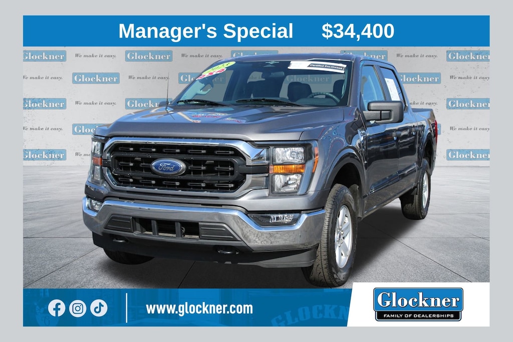 Glockner Chevrolet is proud to offer this trusty 2023 Ford F-150 in Gray. This 2023 Ford F-150 has passed our comprehensive inspection and comes with the following features; 4WD, ABS brakes, Alloy wheels, Compass, Electronic Stability Control, Heated door mirrors, Illuminated entry, Low tire pressure warning, Remote keyless entry, Traction control, 4-Wheel Disc Brakes, 6 Speakers, Air Conditioning, AM/FM radio, Auto High-beam Headlights, Brake assist, Bumpers: chrome, Cloth 40/20/40 Front Seat, Delay-off headlights, Driver door bin, Driver vanity mirror, Dual front impact airbags, Dual front side impact airbags, Emergency communication system: SYNC 4 911 Assist, Exterior Parking Camera Rear, Front anti-roll bar, Front Center Armrest w/Storage, Front fog lights, Front reading lights, Front wheel independent suspension, Fully automatic headlights, Occupant sensing airbag, Outside temperature display, Overhead airbag, Overhead console, Panic alarm, Passenger door bin, Passenger vanity mirror, Power door mirrors, Power steering, Power windows, Radio data system, Radio: AM/FM Stereo w/6 Speakers, Rear reading lights, Rear step bumper, Rear window defroster, Security system, Speed control, Speed-sensing steering, Split folding rear seat, Steering wheel mounted audio controls, SYNC 4, Tachometer, Telescoping steering wheel, Tilt steering wheel, Trip computer, Variably intermittent wipers, Voltmeter, and Wheels: 17 Silver Painted Aluminum.Clean Auto Check/No Accidents Reported, One Owner, Full Balance of Factory Warranty, 4WD, ABS brakes, Alloy wheels, Compass, Electronic Stability Control, Heated door mirrors, Illuminated entry, Low tire pressure warning, Remote keyless entry, Traction control.