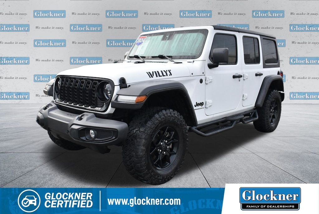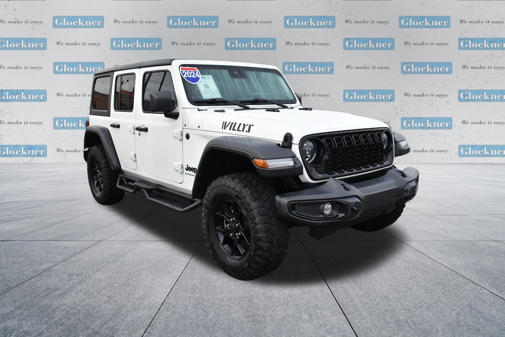 Glockner Chrysler Dodge Jeep Ram of Ashland is proud to offer this handsome-looking and fun 2024 Jeep Wrangler in Bright White Clearcoat. This 2024 Jeep Wrangler has passed our comprehensive inspection and comes with the following features; Quick Order Package 24W Willys (240 Amp Alternator, 4-Wheel Drive Swing Gate Decal, 7 & 4 Pin Wiring Harness, 97 MPH Vehicle Max Speed Calibration, Advanced Brake Assist, Automatic Headlamps, Auxiliary Switches, Black Grille, Class II Receiver Hitch, Conventional Differential Front Axle, Corning Gorilla Glass, Dana M210 Wide HD Tube Front Axle, Dana M220 Wide Rear Axle, Daytime Running Lamps LED Accents, Deep Tint Sunscreen Windows, E-Locker Rear Axle, Enhanced Adaptive Cruise Control, Front 1-Touch Down Power Windows, Front LED Fog Lamps, Full Speed Forward Collision Warning Plus, Injection Molded Black Rear Bumper, LED Premium Reflector Headlamps, Mold In Color Bumper w/Gloss Black, Molded in Color Rubicon Highline Flare, MOPAR All-Weather Floor Mats, Off-Road Plus Mode, Power Heated Mirrors, Premium Wrapped Steering Wheel, Remote Keyless Entry, Security Alarm, Speed Sensitive Power Locks, Sun Visors w/Illuminated Vanity Mirrors, Wheels: 17" x 7.5" Painted Black, Willy's Suspension, Willys, and Willys Hood Decal), Glockner Certified Certified, 110 MPH Vehicle Max Speed Calibration, 4-Wheel Disc Brakes, 8 Speakers, ABS brakes, Air Conditioning, AM/FM radio, Apple CarPlay/Android Auto, Aux Battery, Black 3-Piece Hard Top, Brake assist, Cloth Low-Back Bucket Seats, Compass, Delay-off headlights, Driver door bin, Driver vanity mirror, Dual front impact airbags, Dual front side impact airbags, Electronic Stability Control, Freedom Panel Storage Bag, Front anti-roll bar, Front Bucket Seats, Front Center Armrest w/Storage, Front fog lights, Front reading lights, Integrated roll-over protection, Low tire pressure warning, No Soft Top, Non-Lock Fuel Cap w/o Discriminator, Normal Duty Suspension, Occupant sensing airbag, Outside temperature display, Overhead airbag, ParkView Rear Back-Up Camera, Passenger door bin, Passenger vanity mirror, Power steering, Radio data system, Radio: Uconnect 5 w/12.3" Display, Rear anti-roll bar, Rear reading lights, Rear Window Defroster, Rear Window Wiper/Washer, Speed control, Split folding rear seat, Steering wheel mounted audio controls, Stop-Start Dual Battery System, Tachometer, Telescoping steering wheel, Tilt steering wheel, Traction control, Trip computer, Variably intermittent wipers, and Wheels: 17" x 7.5" Black Steel Styled.