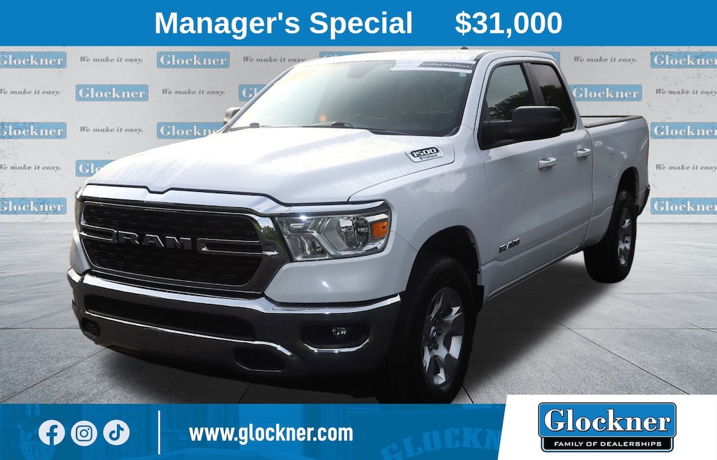 Glockner Chrysler Dodge Jeep Ram of Ashland is proud to offer this outstanding 2022 Ram 1500 in Bright White Clearcoat. This 2022 Ram 1500 has passed our comprehensive inspection and comes with the following features; Quick Order Package 23Z Big Horn (Big Horn Badge), Glockner Certified Certified, ParkView Rear Back-Up Camera, 3 Rear Seat Head Restraints, 3.21 Rear Axle Ratio, 4 Way Front Headrests, 4-Wheel Disc Brakes, 48V Belt Starter Generator, 6 Speakers, ABS brakes, Air Conditioning, Alloy wheels, AM/FM radio, Black Exterior Mirrors, Brake assist, Bumpers: chrome, Cloth Bench Seat, Compass, Connected Services Delete Credit, Convex Wide-Angle Mirror Insert, Delay-off headlights, Driver door bin, Dual front impact airbags, Dual front side impact airbags, Electronic Stability Control, Emergency communication system: SiriusXM Guardian, Front anti-roll bar, Front Center Armrest w/Storage, Front fog lights, Front License Plate Bracket, Front reading lights, Front Seat Back Map Pockets, Front wheel independent suspension, Fully automatic headlights, Global Telematics Box Module (TBM), GPS Antenna Input, Heated door mirrors, Illuminated entry, Integrated Voice Command w/Bluetooth, Leather steering wheel, Low tire pressure warning, Manual Adjust 4-Way Front Passenger Seat, Manufacturer's Statement of Origin, MOPAR Front & Rear Rubber Floor Mats, Occupant sensing airbag, Outside temperature display, Overhead airbag, Overhead console, Panic alarm, Passenger door bin, Passenger vanity mirror, Power door mirrors, Power steering, Power windows, Radio data system, Radio: Uconnect 3 w/5" Display, Rear 60/40 Folding Seat, Rear anti-roll bar, Rear seat center armrest, Rear step bumper, Remote keyless entry, Speed control, Split folding rear seat, Steering wheel mounted audio controls, Tachometer, Telescoping steering wheel, Tilt steering wheel, Traction control, Trip computer, Variably intermittent wipers, Voltmeter, and Wheels: 18" x 8" Cast-Aluminum Painted.