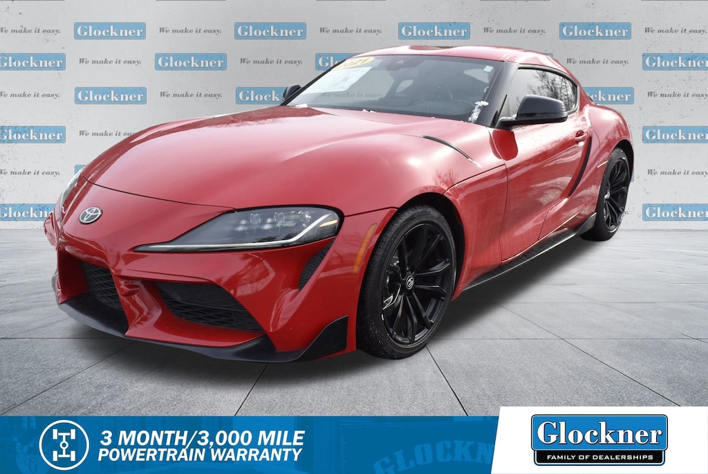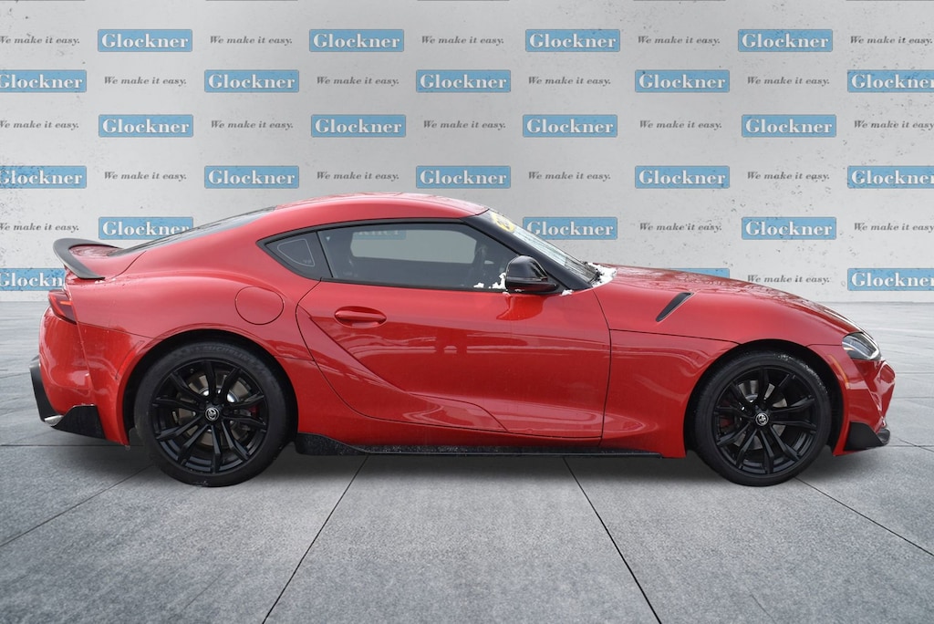 Glockner Honda Toyota is proud to offer this outstanding 2021 Toyota Supra in Renaissance Red 2.0. This 2021 Toyota Supra has passed our comprehensive inspection and comes with the following features; Alcantara/Leather Seat Trim, AM/FM radio: SiriusXM, Automatic temperature control, Exterior Parking Camera Rear, Power driver seat, Wheels: 18 Cast Aluminum, 4 Speakers, 4-Wheel Disc Brakes, ABS brakes, Air Conditioning, Alloy wheels, AM/FM Stereo w/4 Speakers, Auto High-beam Headlights, Auto-dimming door mirrors, Auto-dimming Rear-View mirror, Brake assist, Bumpers: body-color, Child-Seat-Sensing Airbag, Delay-off headlights, Driver door bin, Driver vanity mirror, Dual front impact airbags, Dual front side impact airbags, Electronic Stability Control, Four wheel independent suspension, Front anti-roll bar, Front Bucket Seats, Front Center Armrest, Front dual zone A/C, Front fog lights, Front reading lights, Front Sport Seats, Fully automatic headlights, Garage door transmitter: HomeLink, Heated door mirrors, Illuminated entry, Knee airbag, Leather Shift Knob, Leather steering wheel, Low tire pressure warning, Occupant sensing airbag, Outside temperature display, Overhead airbag, Panic alarm, Passenger door bin, Passenger vanity mirror, Power door mirrors, Power passenger seat, Power steering, Power windows, Radio data system, Rain sensing wipers, Rear anti-roll bar, Rear window defroster, Remote keyless entry, Security system, Speed control, Speed-sensing steering, Speed-Sensitive Wipers, Steering wheel mounted audio controls, Tachometer, Telescoping steering wheel, Tilt steering wheel, Traction control, Trip computer, Turn signal indicator mirrors, and Variably intermittent wipers.